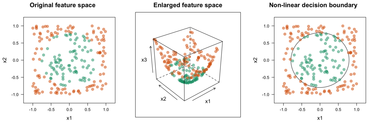 如果当前维度的数据找不到一个合适线性超平面,SVM通过核方法会引入一个新的维度,使变得线性可分。